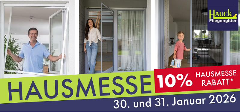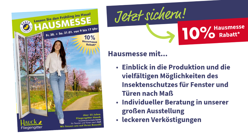Am Freitag, den 30. und Samstag, den 31. Januar, öffnen wir unsere Türen jeweils von 9.00 bis 17.00 Uhr. Sie bekommen einen Einblick in unser Produktsortiment und die vielfältigen Möglichkeiten, die es im Bereich der Insektenschutzelemente für Fenster und Türen nach Maß gibt. Lassen Sie sich von unseren Mitarbeiterinnen und Mitarbeitern beraten. Investieren Sie jetzt und profitieren Sie von unserem 10% Hausmesse Rabatt*.
